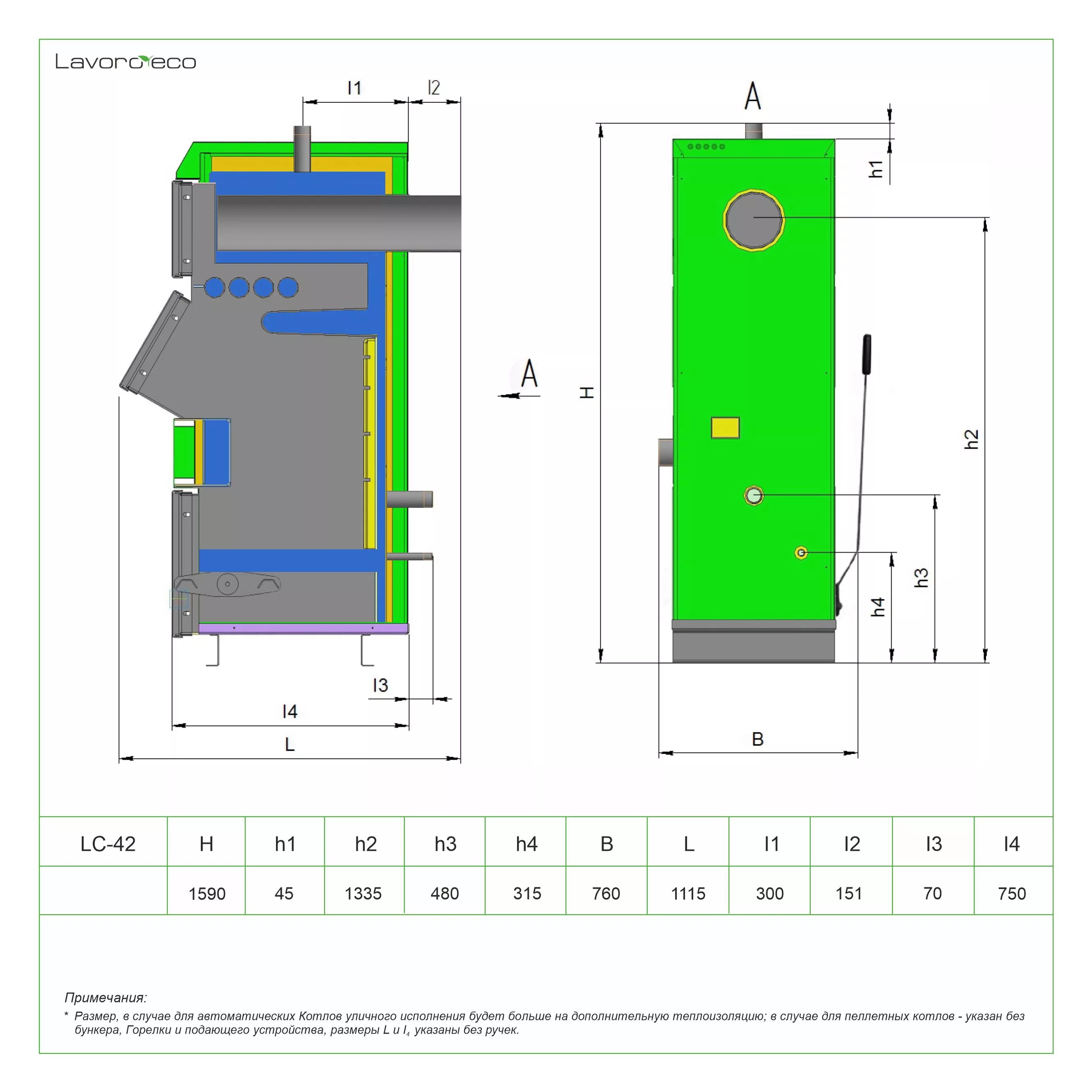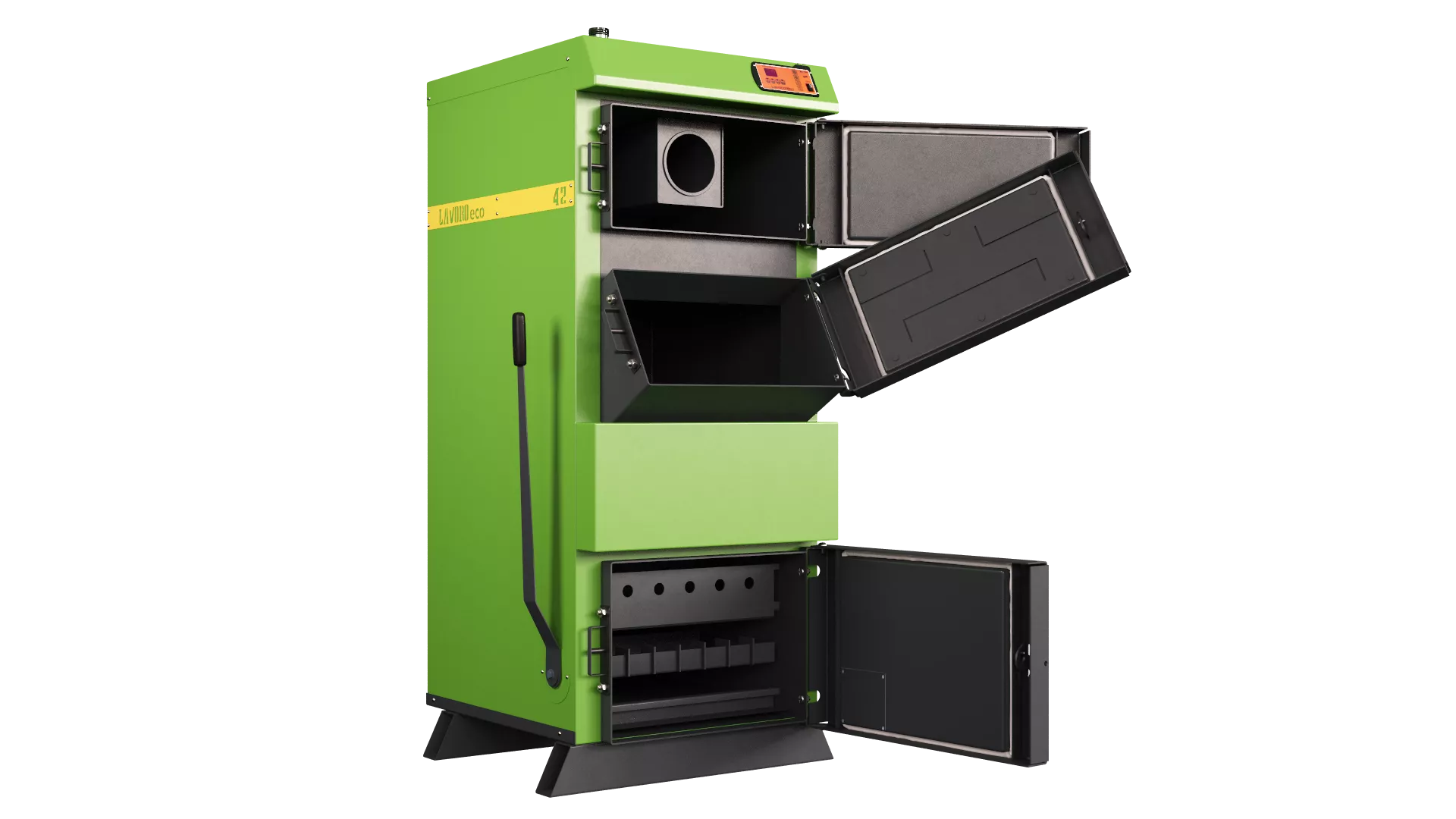 В пиролизном котле «Lavoro eco» не происходит прямого сгорания топлива, поэтому топка имеет небольшие размеры, что в итоге сказывается на размерах самого котла - они значительно меньше обычных твердотопливных.
