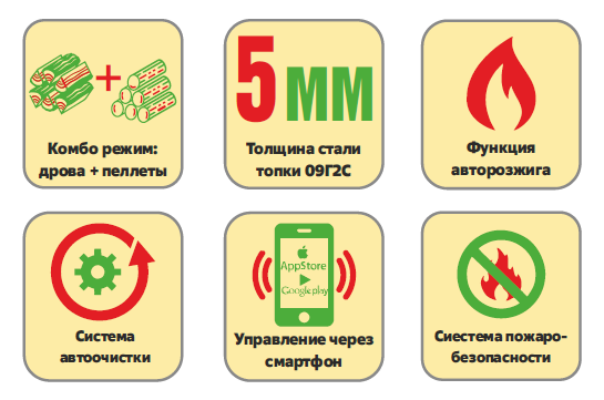Контролируемый процесс горения топлива (регулируется подачей воздуха) — до 12 часов горения с одной закладки топлива (у обычных твердотопливных котлов на дровах около 2-3 часов).