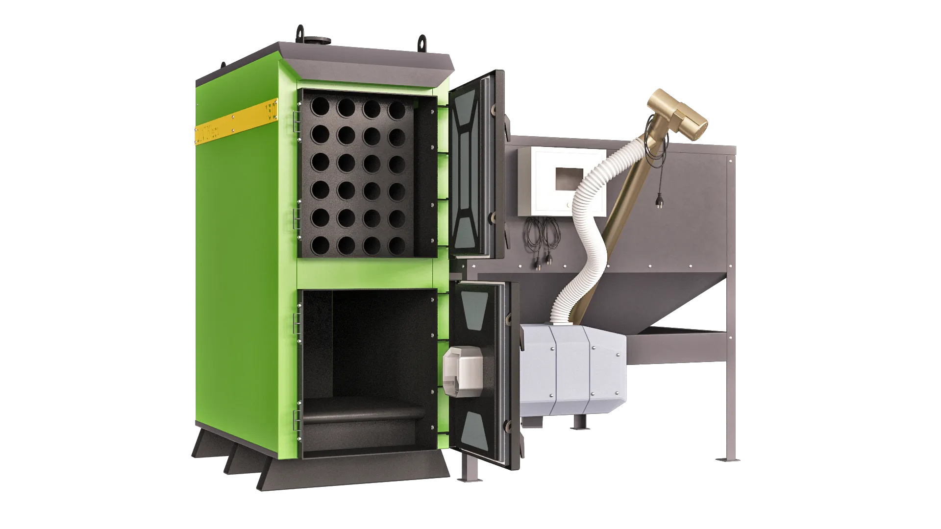 Котел может работать как на пеллетах так и на дровах, для этого требуется комплект колосников*, который устанавливается в топочную камеру. Также котлом можно управлять удаленно, используя интернет модуль, который позволяет контролировать все параметры котла через смартфон в любой точке мира где есть интернет, теперь нет необходимости вызывать специалиста для настройки котла домой, так как все можно настроить удаленно. Также котел данной серии может быть выполнен в компактном исполнении с бункером объемом 1000 л - это сделано для возможности установки пеллетного котла в ограниченном пространстве котельной.