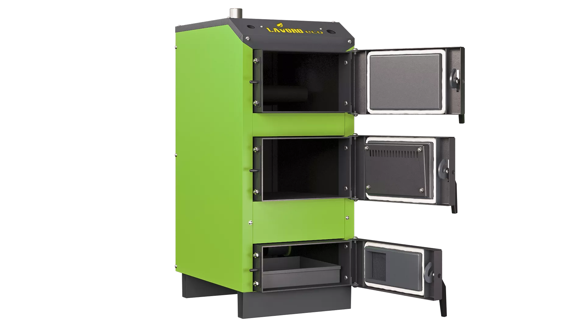 1. В пиролизном котле «Lavoro eco» не происходит прямого сгорания топлива, поэтому топка имеет небольшие размеры, что в итоге сказывается на размерах самого котла - они значительно меньше обычных твердотопливных.