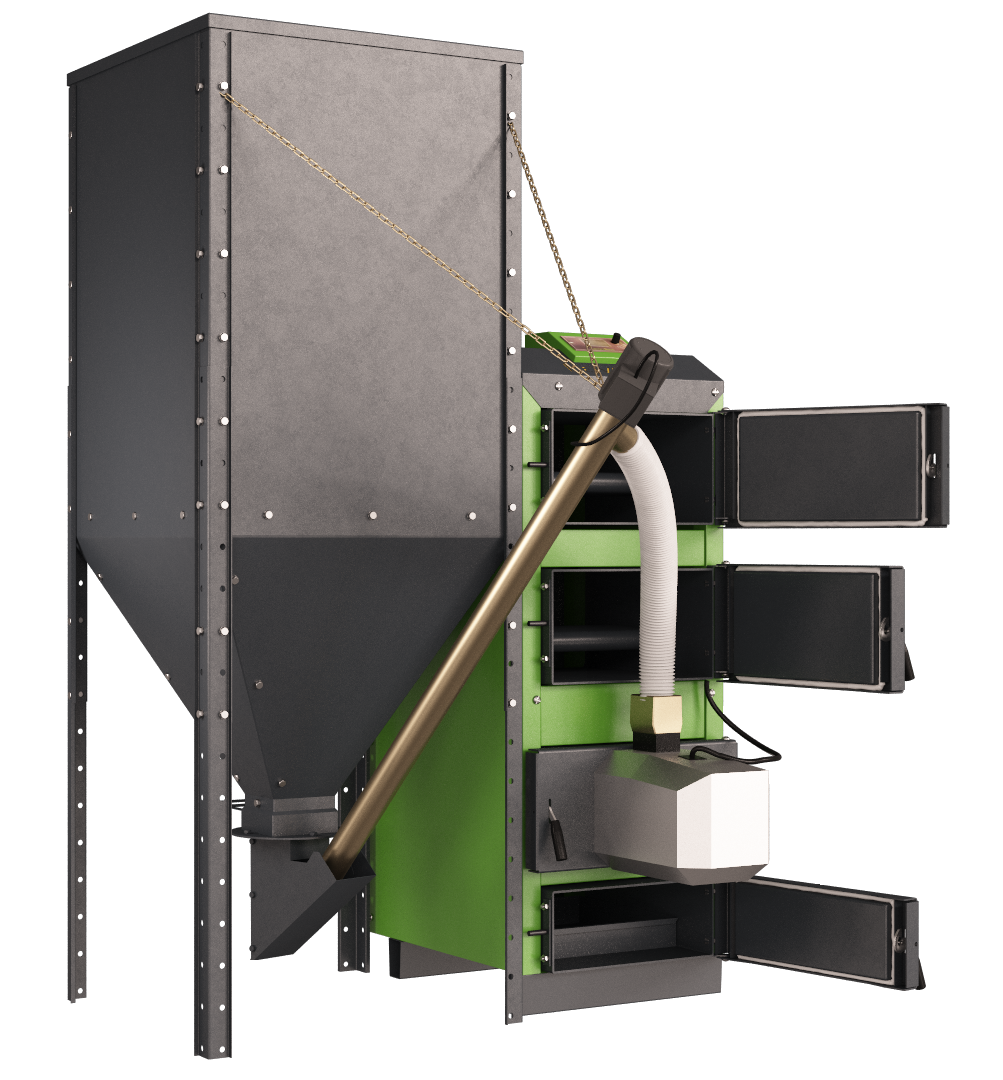 Контролируемый процесс горения топлива (регулируется подачей воздуха) — до 12 часов горения с одной закладки топлива (у обычных твердотопливных котлов на дровах около 2-3 часов).