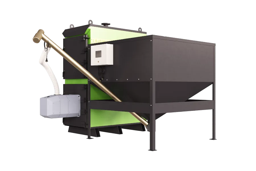 Котел может работать как на пеллетах так и на дровах, для этого требуется комплект колосников*, который устанавливается в топочную камеру. Также котлом можно управлять удаленно, используя интернет модуль, который позволяет контролировать все параметры котла через смартфон в любой точке мира где есть интернет, теперь нет необходимости вызывать специалиста для настройки котла домой, так как все можно настроить удаленно. Также котел данной серии может быть выполнен в компактном исполнении с бункером объемом 1000 л - это сделано для возможности установки пеллетного котла в ограниченном пространстве котельной.
