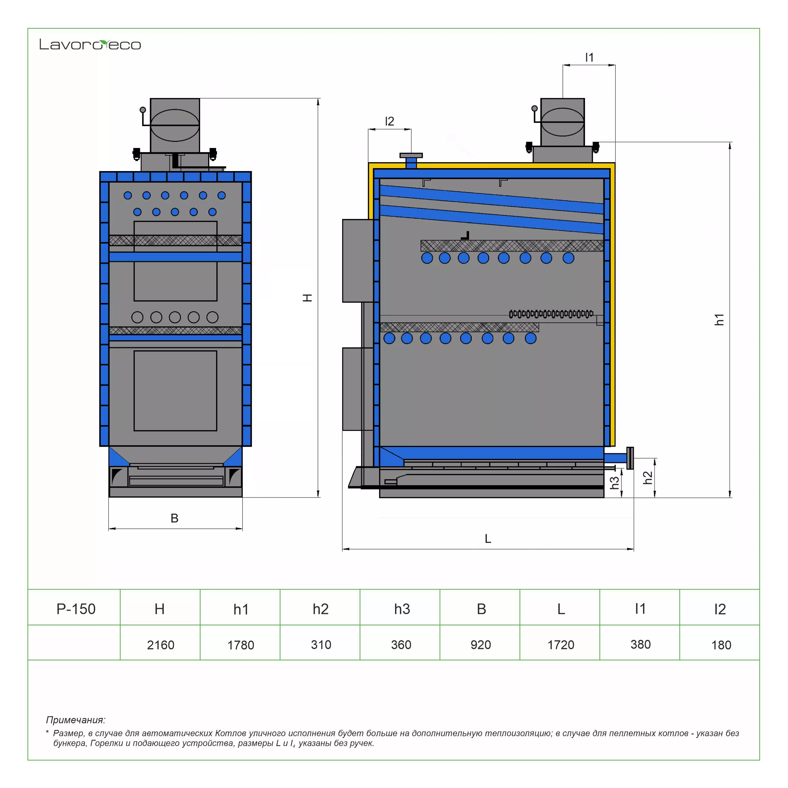 В пиролизном котле «Lavoro eco» не происходит прямого сгорания топлива, поэтому топка имеет небольшие размеры, что в итоге сказывается на размерах самого котла - они значительно меньше обычных твердотопливных.